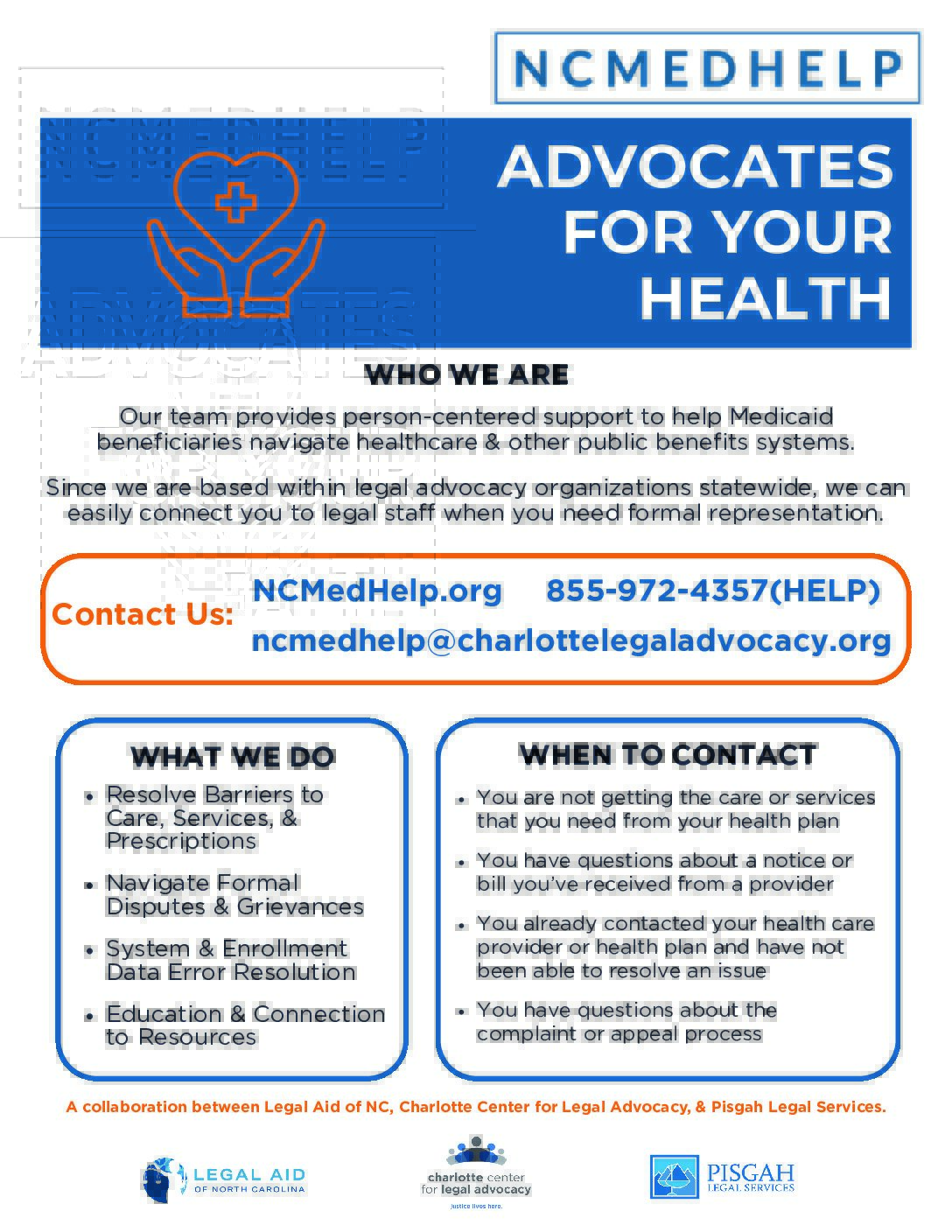 The NCMEDHELP.ORG and NCMEDHELP.COM website is purely informational. The information may change without notice. NCMEDHELP.ORG and NCMEDHELP.COM are not required to keep this website updated. Links may change, and NCMEDHELP.ORG and NCMEDHELP.COM are not responsible for maintaining the correct links. NCMEDHELP.ORG and NCMEDHELP.COM cannot guarantee Medicaid benefits, coverage, payments or approval of any individual. NCMEDHELP.ORG and NCMEDHELP.COM do not offer Medicaid counseling, advice, or direct help. Using this site does not increase your chances of receiving satisfactory interactions with Medicaid. NCMEDHELP.ORG and NCMEDHELP.COM is not the NC Medicaid Ombudsman or NC Navigator Consortium. NCMEDHELP.ORG and NCMEDHELP.COM does not make representations or statements as the NC Medicaid Ombudsman or the NC Navigator Consortium.