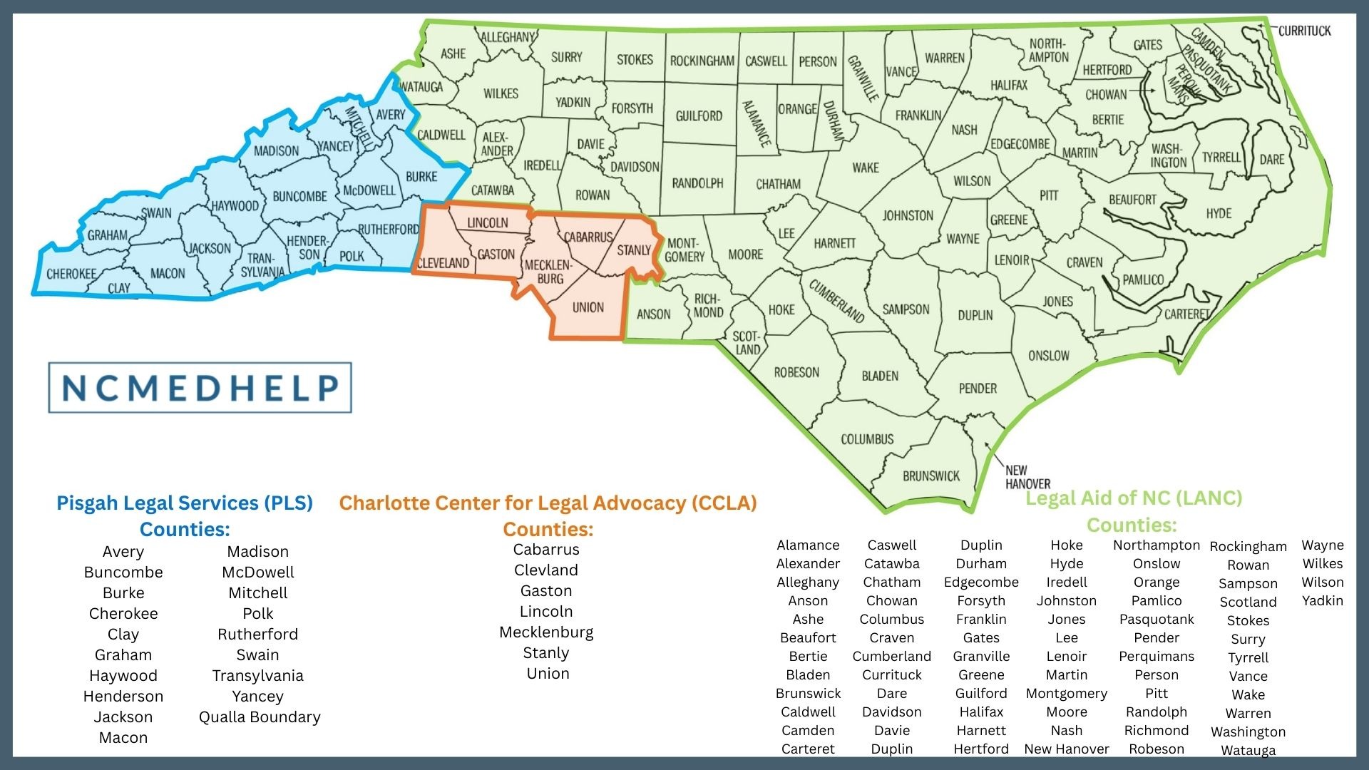 Atendemos a personas en todo el estado, excepto asuntos de Medicaid en los condados atendidos por Charlotte Center for Legal Advocacy y Pisgah Legal Services.